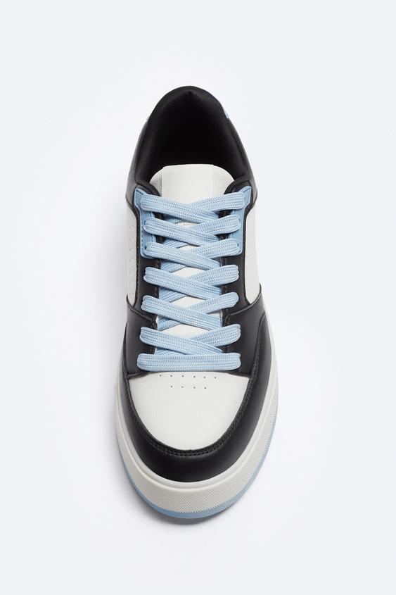 Combination of materials, pieces and colours on the upper. Six-eyelet facing. Irregular and chunky sole.